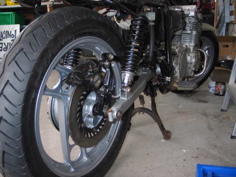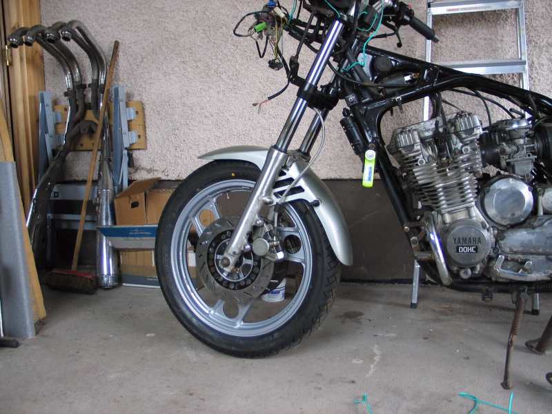 | The CBX lies in a sea of bikes waiting for it's MOT | My naked wheels lie waiting for their "shoes" | Here we go (The eagle eyed among you will have spotted the other XJ back wheel in the picture) |