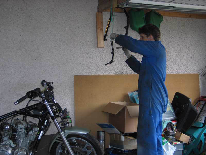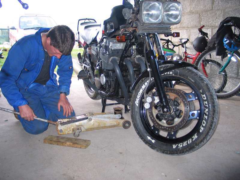 | Douglas wheels the CBX in to the garage, everything looks fine so far | Ok, now we take the weight off the front end with Jack |